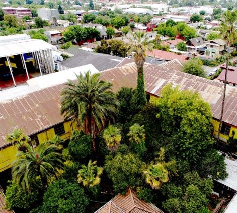 El patio tiene un par de las palmas chilenas más australes del mundo y una serie de especies exóticas importadas a la región, generando una suerte de microclima propio. Hay una cantidad de especies distintas en una lógica paisajística bastante peculiar, como de un huerto desordenado con trazos originales y relativamente sueltos. Uno puede pasear por este patio, ya sea en torno al corredor o muy libremente por el interior.