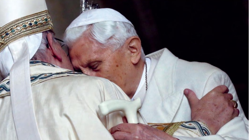 La presencia simultánea de un Papa emérito y un Papa en funciones es una novedad en la Iglesia. Como ellos se estiman, es una novedad feliz. Expresa de manera especialmente evidente la continuidad del ministerio petrino, sin interrupción, como los eslabones de una misma cadena, sellados por el amor. El pueblo santo de Dios en camino lo comprendió muy bien. En cada oportunidad en que el Papa emérito, respondiendo a mi invitación, apareció en público y pude abrazarlo delante de todo el mundo, la alegría y los aplausos de las personas presentes fueron intensos y sinceros.